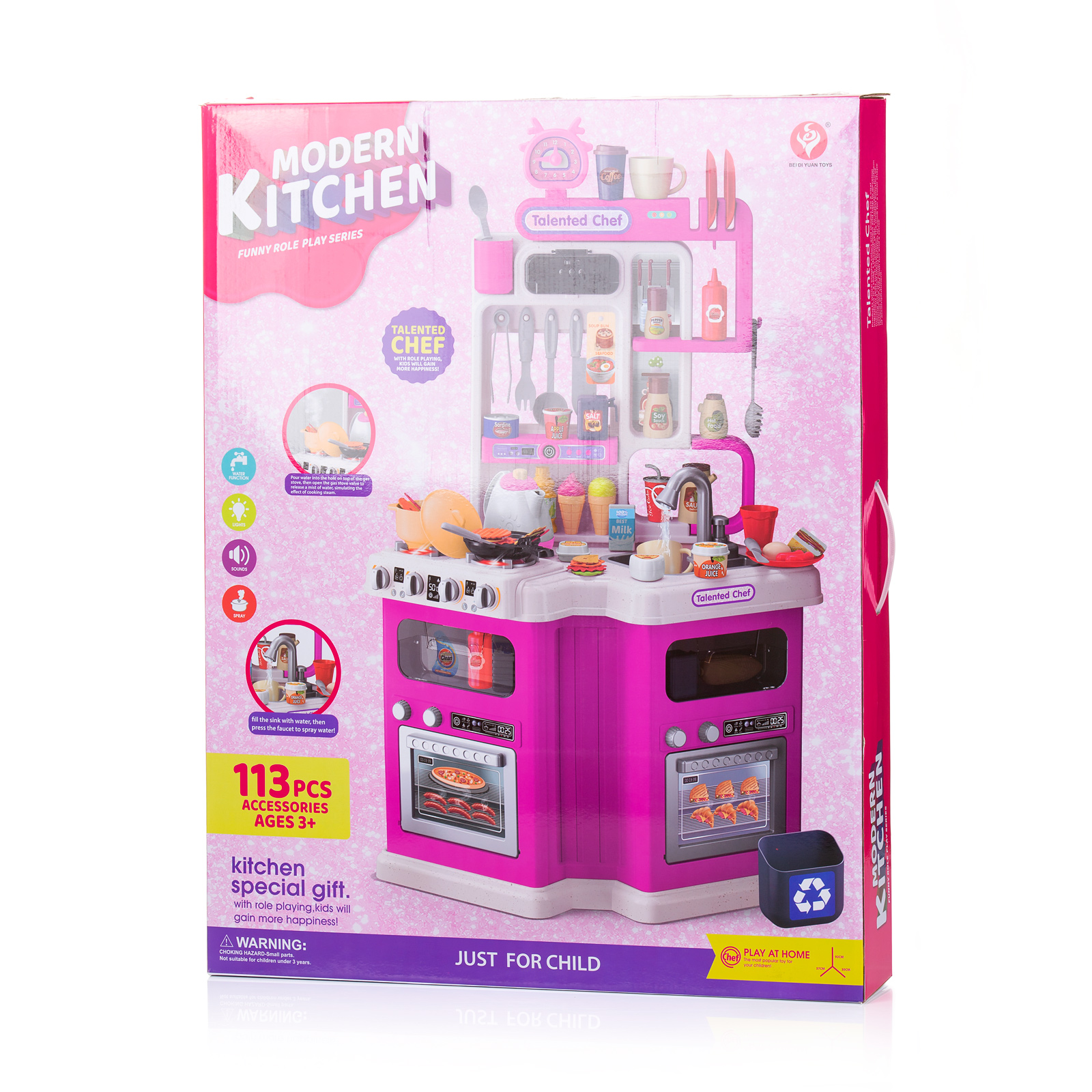 Мултифункционален кухненски комплект за малки талантливи готвачи и часове забавна игра вкъщи. Комплектът има различни реалистични ефекти – звуци, светлини, ефект пара, ефект течаща вода,с които децата ще се забавляват и ще научават основни дейности и процеси в кухнята. Ролева игра, която стимулира въображението на децата, подобрява двигателните им умения и насърчава усвояването на нови знания.